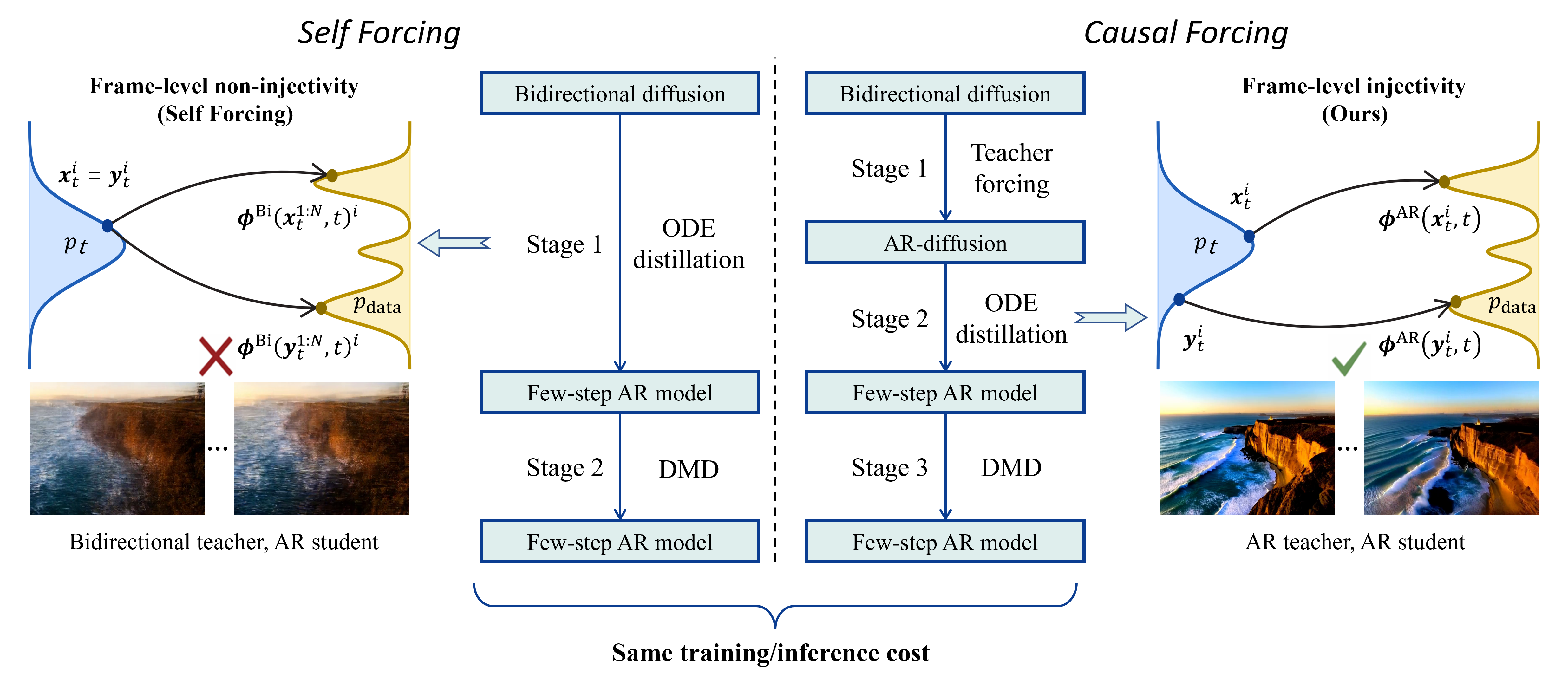 We identify a theoretical flaw in Self Forcing’s training pipeline during ODE initialization: a bidirectional teacher should not be used to supervise an autoregressive student, as this violates frame-level injectivity. Motivated by this analysis, we propose Causal Forcing: we first fine-tune a bidirectional base model into an autoregressive diffusion model, then use it as the teacher for ODE initialization, followed by the same DMD stage as in Self Forcing. Our method significantly outperforms Self Forcing in both visual quality and motion dynamics, while keeping the training budget and inference efficiency unchanged.